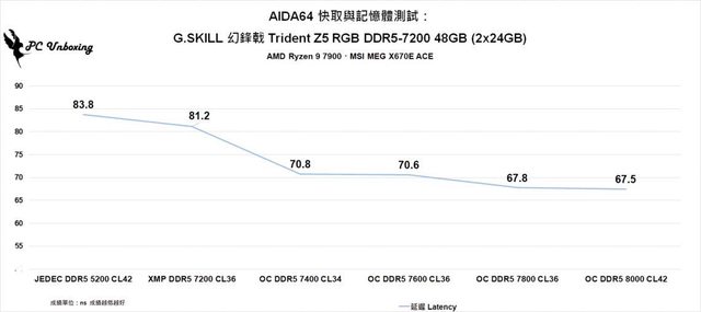 的讀寫性能,而延遲表現最終從 83.8 ns( JEDEC 頻率)降至 67.5 ns。