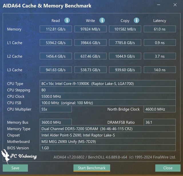 在開啟 XMP Profile DDR5-7200 MT/s CL36-46-46-115 1.35V 後,測試成績為讀寫 112810