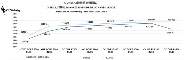 後續筆者也手動超頻至最高 8266 MT/s 並進行測試,測試成績為讀寫 125960 MB/s 跟 103