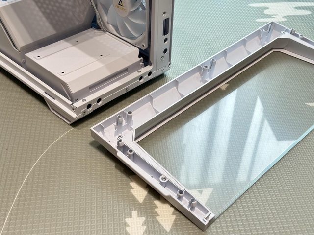 前面板以卡榫方式固定於機殼上,玻璃側板部分皆採用厚實的4mm規格,搭配邊框作施力
