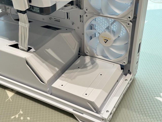 底部電源艙為了與前方3顆12cm風扇搭配,縮短了部分長度且做成斜角設計,還設置了一