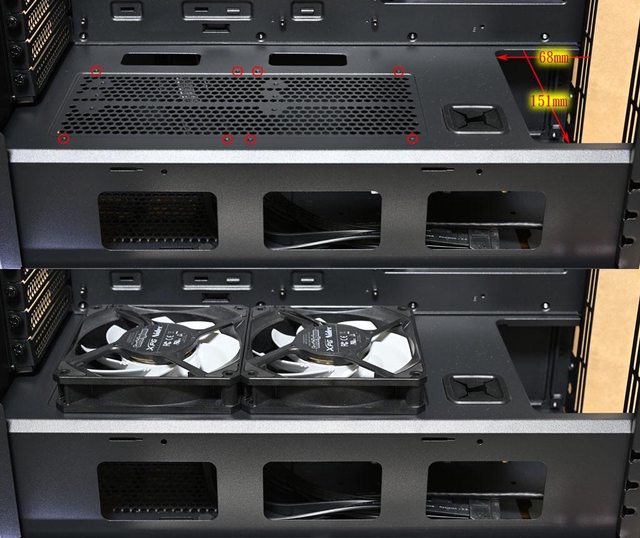 開口,前方開口大小151×68mm,網狀通風口外圍有120mm風扇鎖點(紅色框),可安裝2個