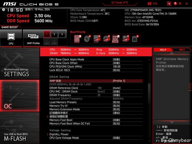 礎頻率是DDR5-5600,最高XMP設定為DDR5-8000,CL值38-48-48-84。