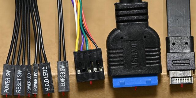 示燈接頭,5為燈光按鈕接頭,6為耳機麥克風插座接頭,7為USB3.2 Type-A主機板接頭,