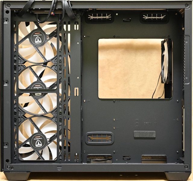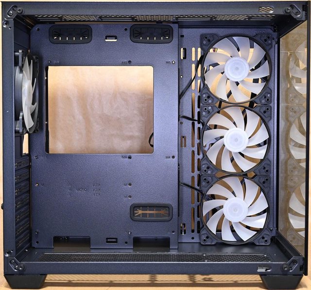 ▼左艙配置圖,右側前方風扇架預裝3個120mm ARGB從控反向風扇