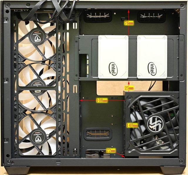 源供應器與右艙底部距離22mm,右艙可拆卸式固定架與電源供應器距離25mm,右艙可拆卸