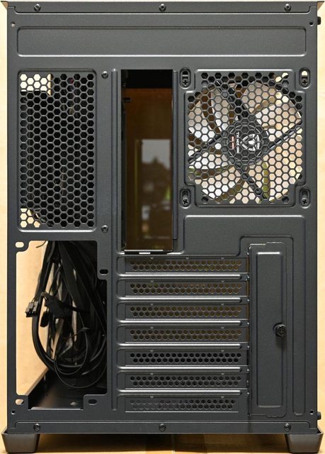 ▼機殼後方,左艙上方通風口可裝1個120mm風扇,左艙下方7個標準擴充槽頂端蓋板使用