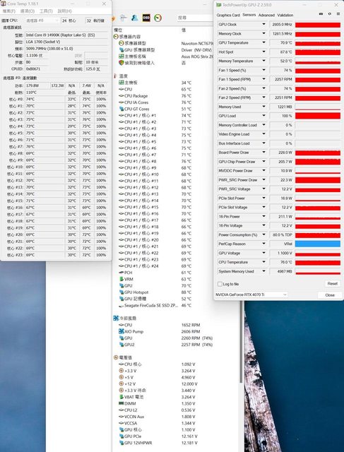 ▼風扇裝在底部的CPU+GPU高負載前Core Temp、GPU-Z感測器、AIDA64感測器頁面