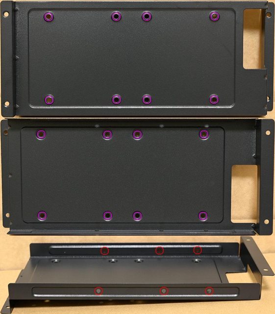 ▼右艙可拆卸式固定架可安裝2個2.5吋裝置(紫色孔)及1個3.5吋裝置(兩側紅色孔)
