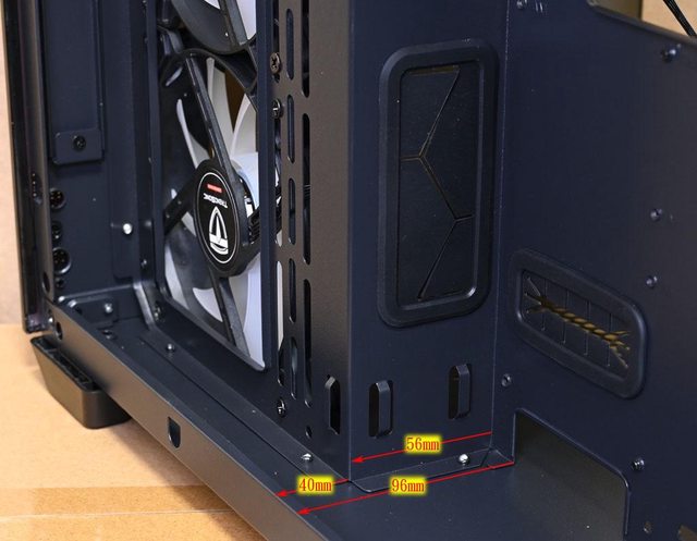 ▼右側前方風扇架與主機板底板之間距離56mm,右側前方風扇架與右側板之間距離40mm,