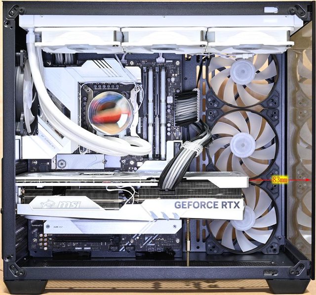 左側距離24mm,顯示卡底部與機殼右側前方風扇架距離81mm