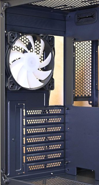 ▼左艙後方預裝1個120mm ARGB主控風扇,7個標準擴充槽均使用一次性擋板,拆卸後無法
