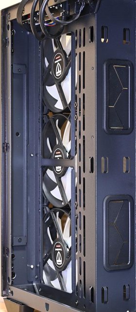 ▼右側前方風扇架寬度168mm,長條形固定孔可裝3個120mm風扇,水冷排可裝280mm