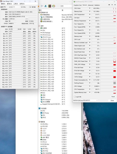 ▼風扇裝在右側前方的CPU+GPU高負載前Core Temp、GPU-Z感測器、AIDA64感測器頁面
