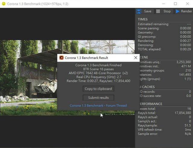 corona 1.3 EPYC 7642 17M rays/s比7950X的12M rays/s快了近40%