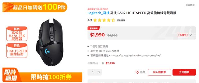 發現G502 LIGHTSPEED 現在用券折完$1890 好像算歷史低價 而且再送100P=1790入手