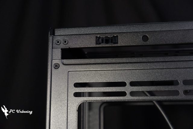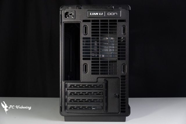 機殼後方可以安裝 120 mm 的風扇以及最多四槽 PCIE 設備,上半部有電源供應器延長插座