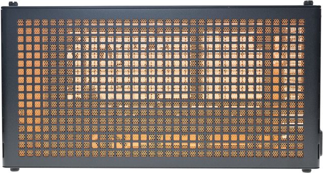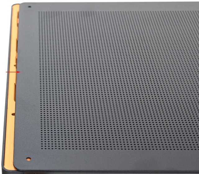 ▼前方方格狀通風網孔搭配橘色內磁吸式過濾網,右下有I/O埠、按鈕與指示燈,由上至