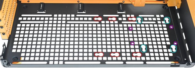▼可調整式顯示卡支撐架安裝完成示意圖,橘色立架可在機殼底部長條狀固定孔調整位置