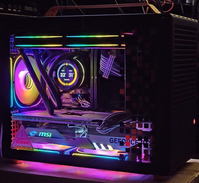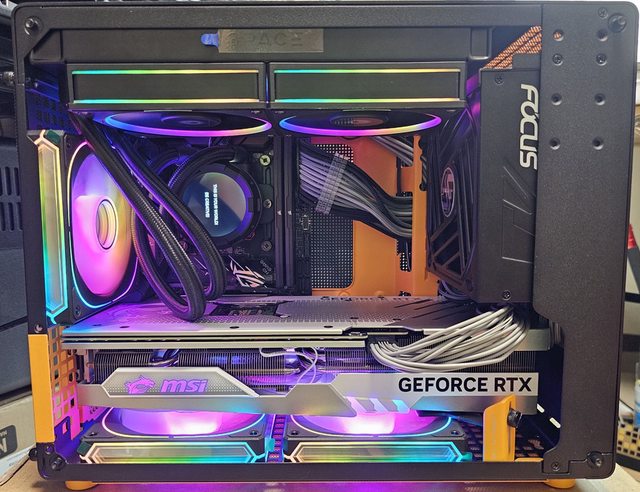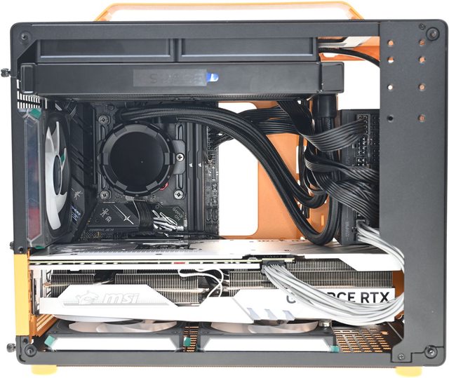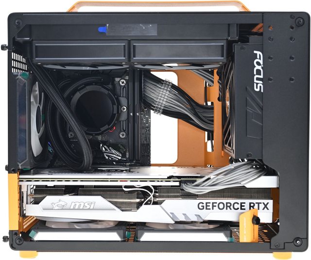▼側裝SFX電源並安裝MSI GEFORCE RTX 4070 Ti GAMING X TRIO WHITE(337×140×62mm)