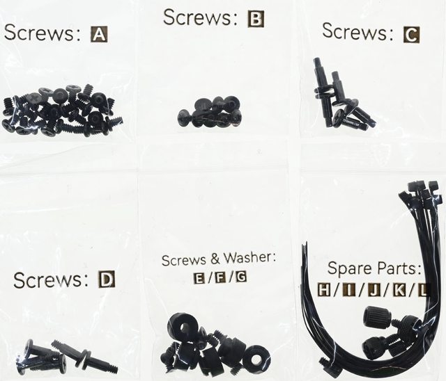 絲(D袋)、底部墊圈/十字皿頭螺絲/內六角皿頭螺絲(E/F/G袋)、束帶/主機板銅柱/銅柱套