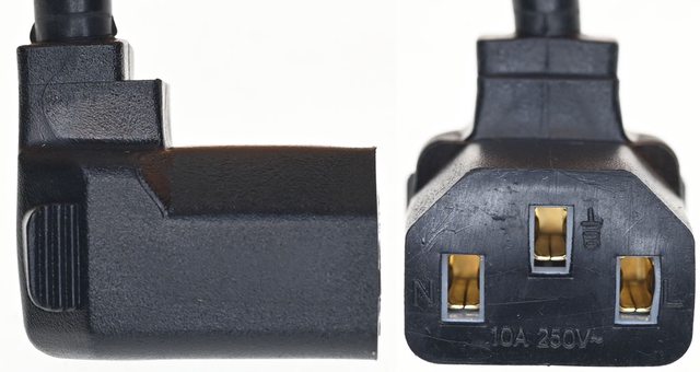 ▼連接電源供應器交流輸入C14插座的L型C13插頭,額定電流為10A