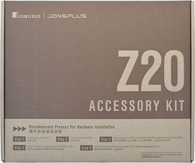 ▼配件紙盒上蓋有JONSBO/JONSPLUS商標、Z20 ACCESSORY KIT字樣、硬體安裝建議流程(