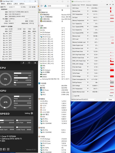 ▼CPU+GPU高負載前Core Temp、GPU-Z感測器、AIDA64感測器頁面