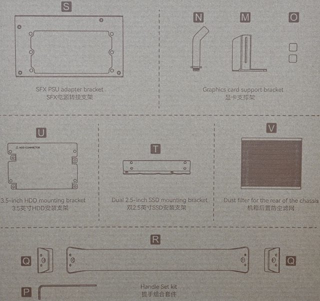 ▼透明盒內有主機板/電源/可調整式顯示卡支撐架組合套件/3.5吋裝置安裝支架/SFX電源