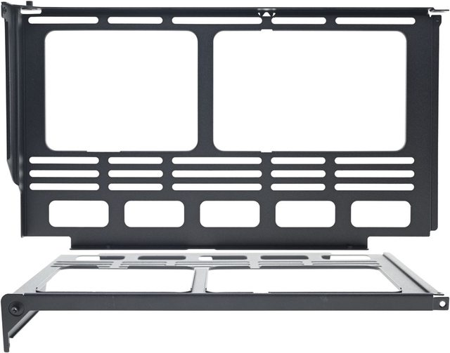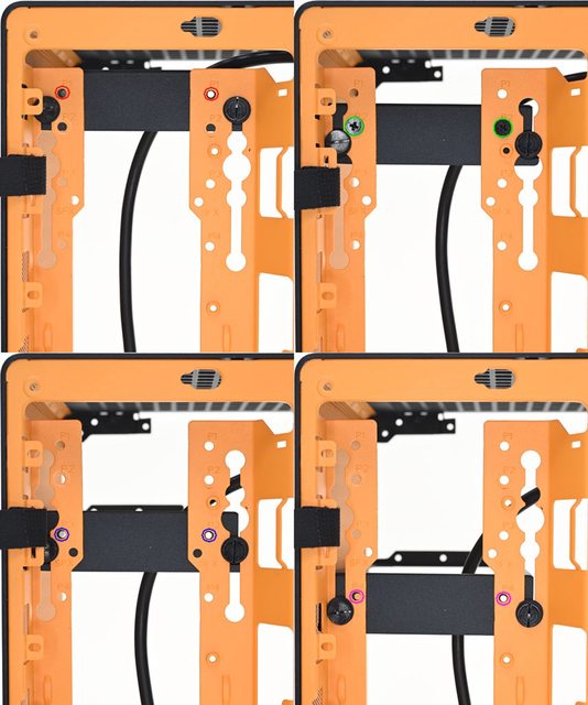 ,顯示卡黑色托架可在橘色立架長條狀固定孔調整高度,若顯示卡厚度較厚,可將黑色托