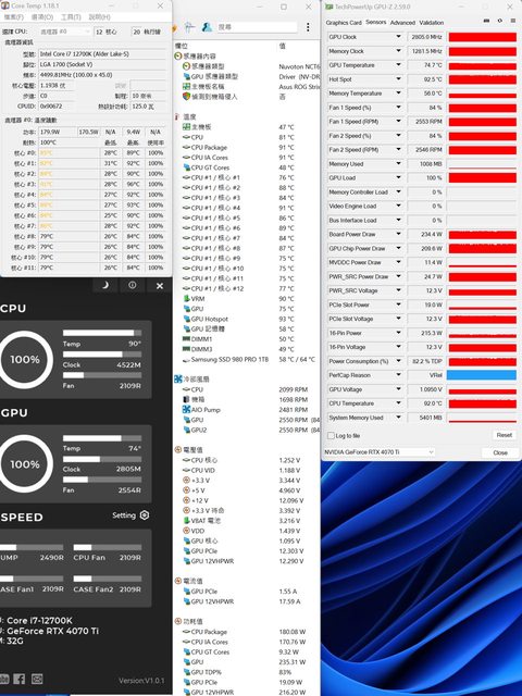 ▼CPU+GPU高負載30分鐘後Core Temp、GPU-Z感測器、AIDA64感測器頁面