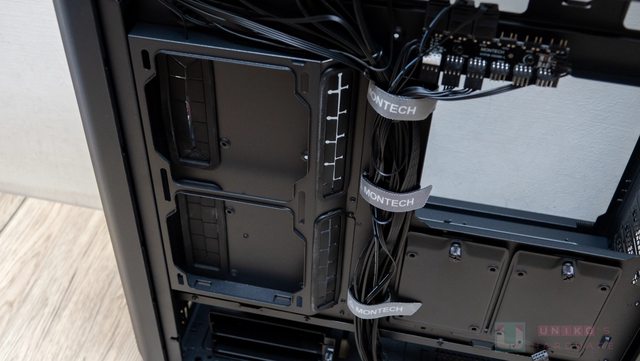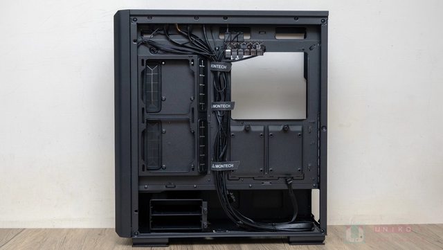 覆蓋主機板艙的是透明玻璃,以轉軸搭配磁吸方式固定,另外還做了一個有 Montech 字樣