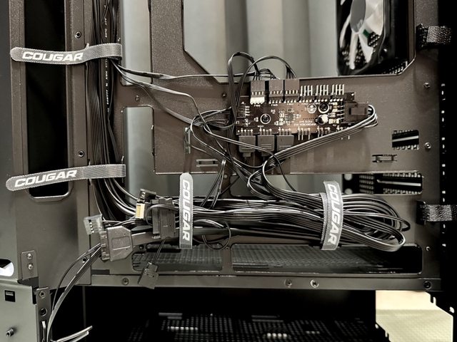 主機板背面硬碟架下方藏有6埠FAN及ARGB HUB,預附的3顆風扇則已先佔據其中3孔。