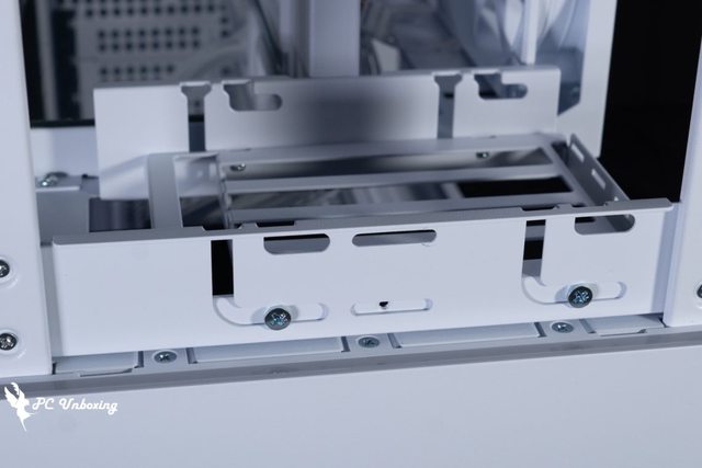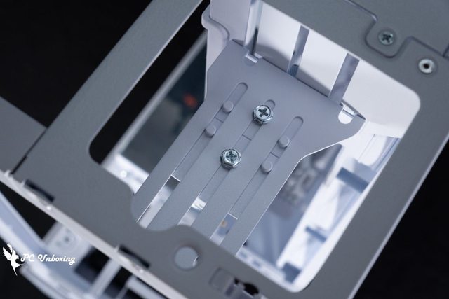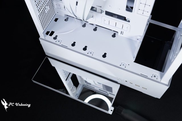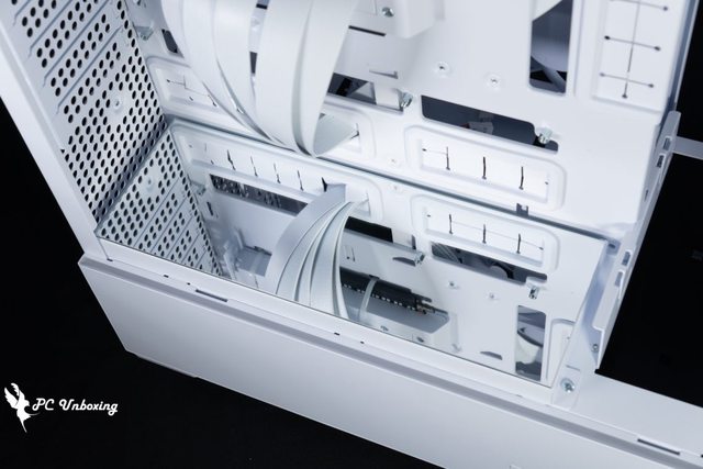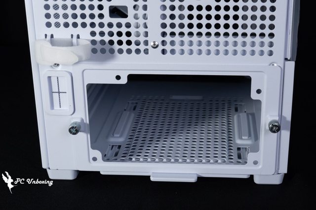 ↑下置式電源安裝空間,左邊小孔是螢幕出線孔,上面小孔則是 PCIE 後方風扇線材孔。