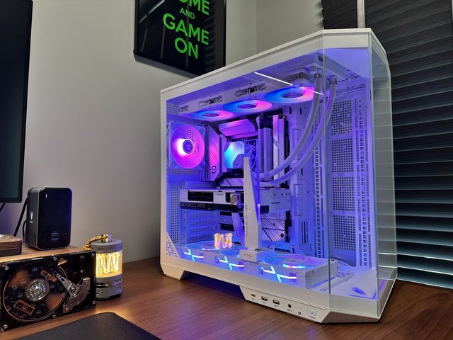 裝上顯示卡後是另一種風情,就可惜RTX4070 Super Dual上有一條粗黑的線條,在幾乎白