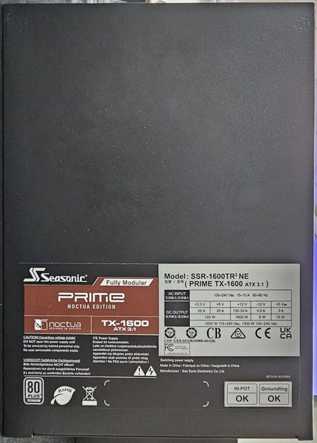 ▼Noctua貓頭鷹風扇聯名版PRIME TX-1600的電源標籤,此電源為100-240V輸入,但100V