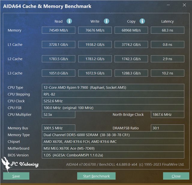 開啟 XMP Profile 2 的 DDR5-6000 後,讀寫性能為 74549 MB/s 跟 76676 MB/s,延遲