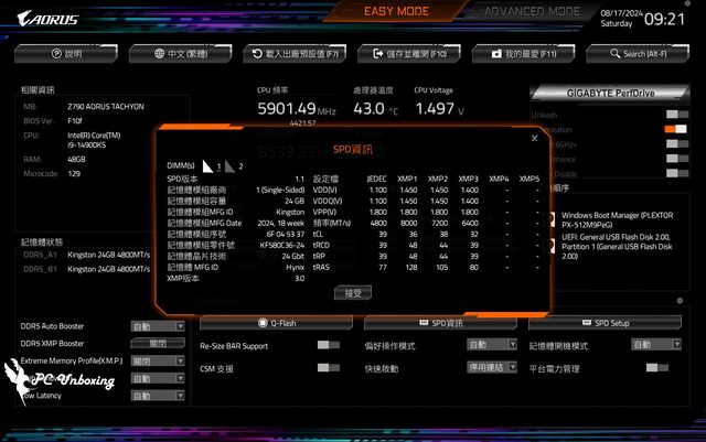 以筆者手上現有的兩個 2 DIMM(1DPC) 測試平台來說,Z790 AORUS TACHYON 除了可以開