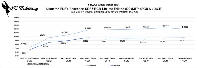 Limited Edition 的讀寫性能,在開啟 XMP Profile 1 DDR5-8000 之後,測試成績為讀