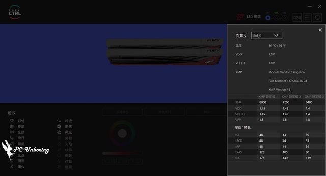 用自家軟體 Kingston FURY CTRL 設定 18 種預設燈光效果之外,也可以支援 GIGABYTE