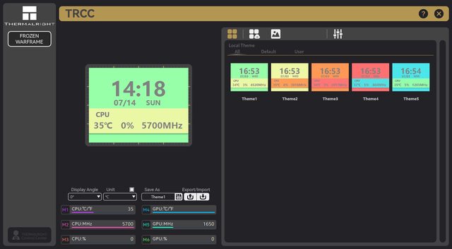 面、顯示角度、溫度單位、另存佈景主題名稱/儲存/匯出/匯入、硬體監控M1至M6所選顯