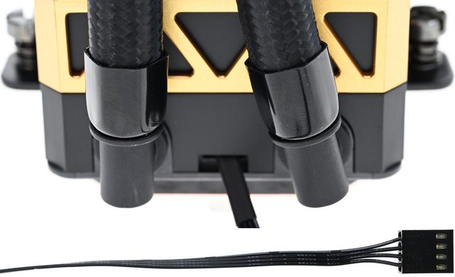 ▼水冷頭進/出水管直角接頭可小幅度左右旋轉,接頭之間接出幫浦4pin PWM線路,長度