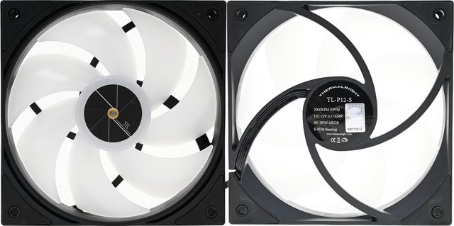 有TL及THERMALRIGHT字樣,外框中心標籤上有THERMALRIGHT字樣、型號、轉速、電壓/電