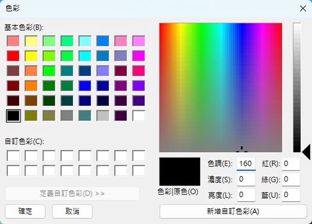 ,右邊為自定義色彩調色盤,設定好色調/濃度/亮度/紅/綠/藍數值後點擊新增自訂色彩