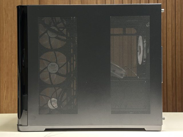 另一側板為金屬材質,在前進風及後方硬碟、電源架位置設有長條細緻通風開孔,因孔徑