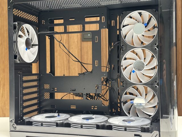 曲境界最大支援ATX規格主機板,且支援背插主機板。內部可見預附6反葉、1正葉共7顆風