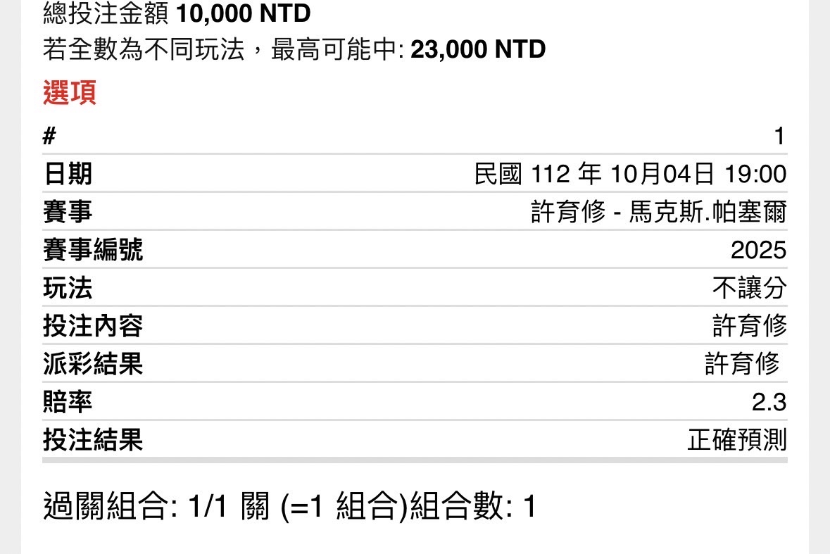 推 MambaKiller: 剛看比賽,許發球沒想像中弱,期待 114.136.49.193 10/06 16:44
