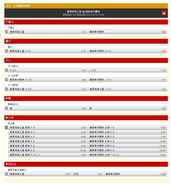 推 rockyshen: 橫濱廣島5.5小 軟銀羅德6.5小 36.236.223.217 10/14 09:35