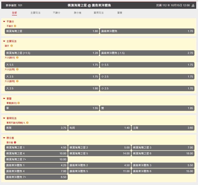 推 michael71230: 橫濱廣島5.5大 軟銀羅德6.5大 27.51.48.63 10/15 10:55