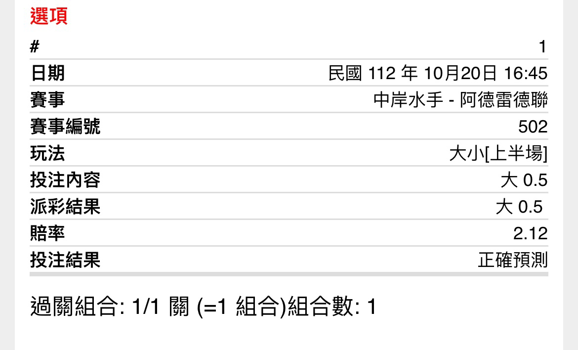 噓 Taiwan007: 剛開始上半1.5小有1.50真的很甜,可惜 223.138.20.49 10/20 17:13